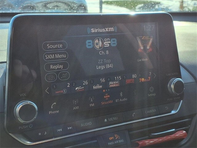 17" Machined Alloy Wheels, 4-Wheel Disc Brakes, 6 Speakers, ABS brakes, Air Conditioning, Alloy wheels, AM/FM radio: SiriusXM, Auto High-beam Headlights, Blind Spot Warning, Brake assist, Bumpers: body-color, Chrome Bumper Protector, Cloth Seat Trim, Delay-off headlights, Driver door bin, Driver vanity mirror, Dual front impact airbags, Dual front side impact airbags, Electronic Stability Control, Floor Mats/Trunk Mat/Hideaway Net, Four wheel independent suspension, Front anti-roll bar, Front Bucket Seats, Front Center Armrest, Front reading lights, Fully automatic headlights, Illuminated entry, Knee airbag, Low tire pressure warning, NissanConnect featuring Apple CarPlay and Android Auto, Occupant sensing airbag, Outside temperature display, Overhead airbag, Overhead console, Panic alarm, Passenger door bin, Passenger vanity mirror, Power door mirrors, Power driver seat, Power steering, Power windows, Radio data system, Radio: AM/FM Audio System, Rear anti-roll bar, Rear Parking Sensors, Rear reading lights, Rear seat center armrest, Rear side impact airbag, Rear window defroster, Remote keyless entry, Security system, Speed control, Speed-sensing steering, Speed-Sensitive Wipers, Split folding rear seat, Sport steering wheel, Steering wheel mounted audio controls, Tachometer, Telescoping steering wheel, Tilt steering wheel, Traction control, Trip computer, Trunk Organizer Tray, and Variably intermittent wipers.